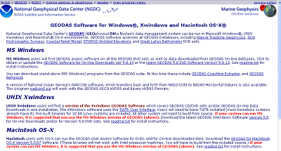 MS Windows users will find GEODAS access software on all the GEODAS DVD sets as well as data downloaded from GEODAS On-line datbases. Click to obtain or update the GEODAS Software for On-line Downloads Ver 5.0.13 or the latest GEODAS 5.0 DVD Software Version 5.0.13. See readme.txt for install instructions.