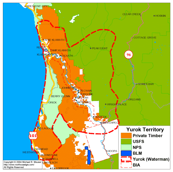 Note that all of these map layers, with the exception of the Yurok aboriginal layer, were extracted from various U.S. government and other data sets. This data may or may not be accurate or current. One part of this project is to verify the accuracy of each of these layers. The Yurok aboriginal layer was first scanned from a map in Yurok Geography by T.T. Waterman and then digitized with Maptitude GIS. This layer should be confirmed and/or adjusted with the direction of Yurok and neigboring tribal people. For these reasons the maps shown on this page and the downloadable GIS layers should be considered a "first cut" -- a draft -- of the current and historical geography of the region. If you have information and/or would like to be part of working on this or any other map layer, please contact me.