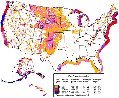 United States wind map shows the wind energy resource at 50 meters above the ground. You can view a larger version or download a  printable map (PDF 2.6 MB)