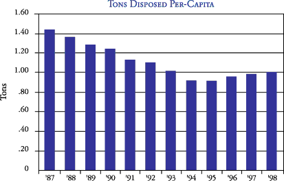 Santa Clara County has reduced its annual disposal tonnage by 17% since 1987, sending about 357,500 fewer tons to the landfill than 11 years ago. However, total tons disposed has been increasing since 1994 due to population growth and increased economic activity. In 1998 one ton of solid waste was disposed for each person in Santa Clara County, down from 1.44 tons per person in 1987.
